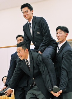 北海道日本ハムファーターズからドラフト2位指名を受けた藤田琉生投手(18)のプロ入団激励会が先月22日、藤沢商工会館ミナパークで行われた。藤田投手が所属していた中学生硬式野球チーム「湘南クラブ」の主催。野球関係者やクラブOBら会場に駆けつけた約350人が祝福した。
