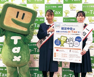 署長を務め益子さんは「うれしい。授業で税の大切さを学び、改めてすごいと思いました」と喜びを話し、山口さんは「税は将来を作り、つなげていく、かけがえのないものだと思います」と意義を話した。丸山署長は「若い人が税に関心を持って身近に感じてもらえることがうれしい」と話した。