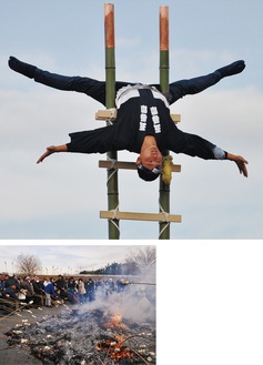 飾り終えた門松やしめ縄といった正月飾りを持ち寄って燃やし、家内安全や無病息災、五穀豊穣を願う伝統行事「どんど焼き」が12日、境川遊水地公園(今田遊水地)で行われた。今田北・南・団地の3自治会の共催。今田北自治会と藤沢鳶職連合会の会長を務める諏訪間昇一さんの計らいで、今年は藤沢市消防出初式での演技を終えた藤沢鳶職組合の職員が「はしご乗り」を披露した。