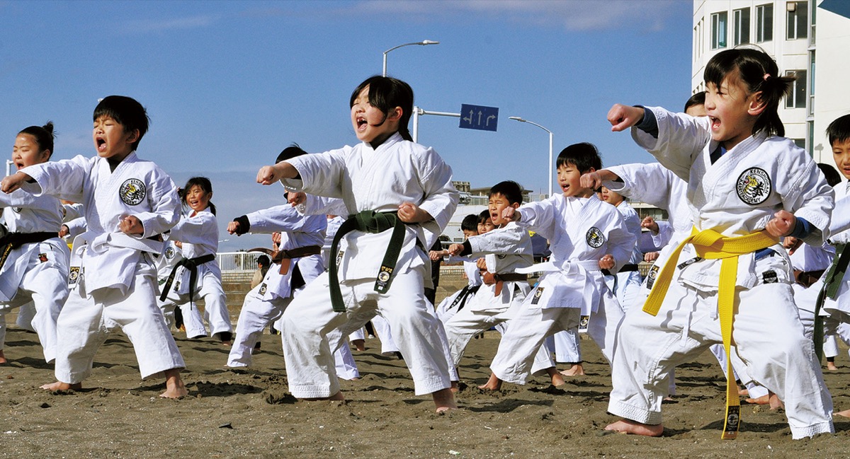 前列に並んだ子どもたちは合図に合わせて「はい!はい!はい!」と突きを繰り返した=写真。指導者から時折「声が小さい」とげきが飛び、冷たい潮風をものともせず「押忍!」と返す姿を見学した保護者らはほほ笑ましそうに見守った。
