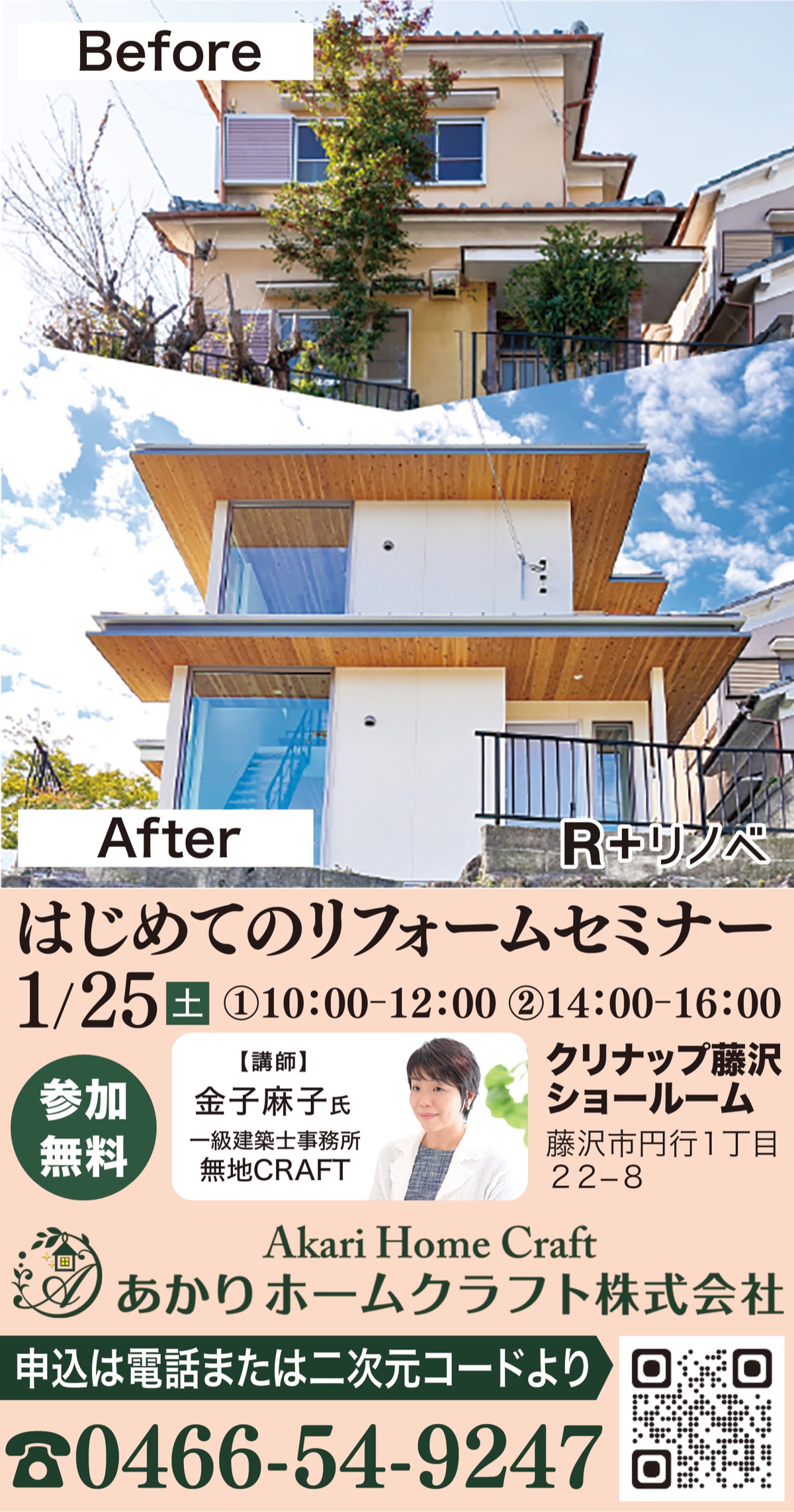 そんな悩みを抱える人はあかりホームクラフト(株)が開催する「はじめてのリフォームセミナー」に行ってみては。数々の住まいをより美しく、暮らしやすくしてきた建築家が、プロならではのアイデアや工事の注意点を無料で教えてくれる。参加後アンケート回答で特典もプレゼントされる。