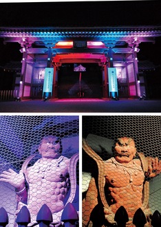 日蓮宗の名刹として知られ、日蓮聖人が「龍ノ口の法難」に遭遇した地とされる歴史的な意義のある同寺。色鮮やかなカラーリングで動きのあるライティングが本堂・仁王門を照らしている。