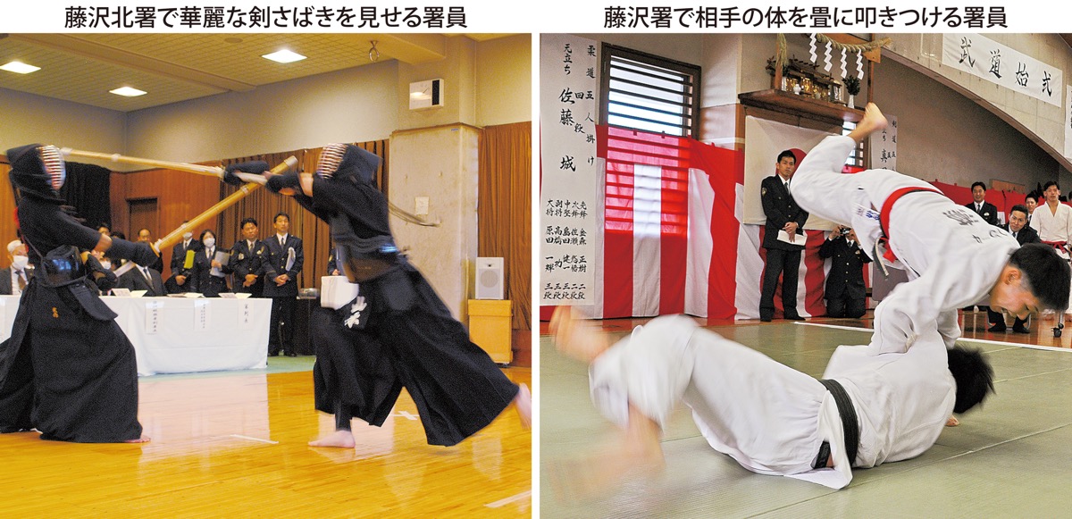 警察署員が日頃鍛錬を積んだ勇ましい姿を披露し、士気を高める年初恒例の「武道始式」が藤沢北警察署(仲戸川博幸署長)で16日、藤沢警察署(島村雅夫署長)で21日に開かれ、剣道と柔道で技を競い合った。