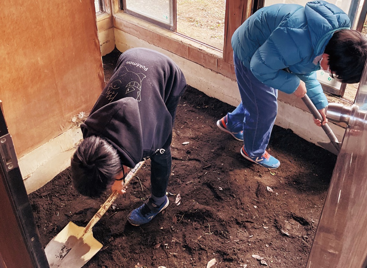 また、学校内の飼育小屋では、植物や花を育てるビニールハウスへの改修作業が行われた。地域のデザイン会社が協力し、日差しが入りやすくするために壁一面がビニールとガラスになり、児童は小屋の中に土を敷いた。2月中には完成させ、卒業式で使う花などを育てる予定だという。
