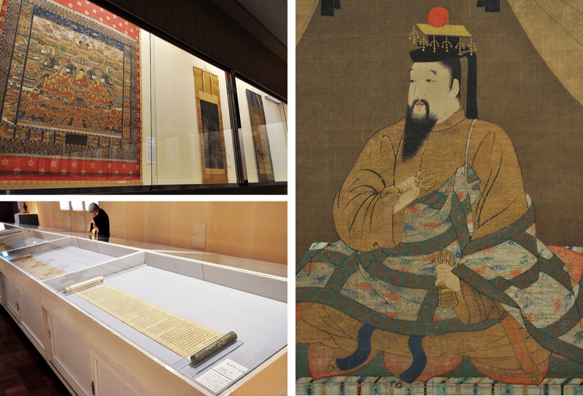 館内でまず目を引くのが、歴史の教科書に掲載されるなど有名な天皇肖像画「後醍醐天皇御像」(国指定重要文化財)。南北朝時代の生前に描かれた寿像で、後醍醐天皇の従兄弟関係にあった同寺12代・尊観上人により伝えられたとされる。