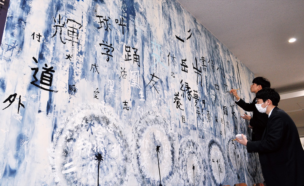 今月5日から守谷さんが天然藍を使用したセメントで下地を作り、23日には生徒が「学」「楽」「心」など3年間を表す漢字一字を書いた。「岳」と力強く筆を走らせた小島悠暉さんは山岳部の部長で「人生は山。登ったり、下ったりする人生を楽しんでいきたい」と笑みをこぼした。漢字を綿毛に見立てており、下にある字は小さく、上にあるほど大きな字になった。「指示した訳ではない。行動心理ですかね」と守谷さんは笑った。
