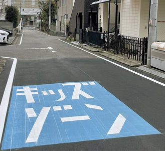 設定された道路には大きく水色の道路標示があり、自動車や自転車などを運転する人に注意を呼びかけている。