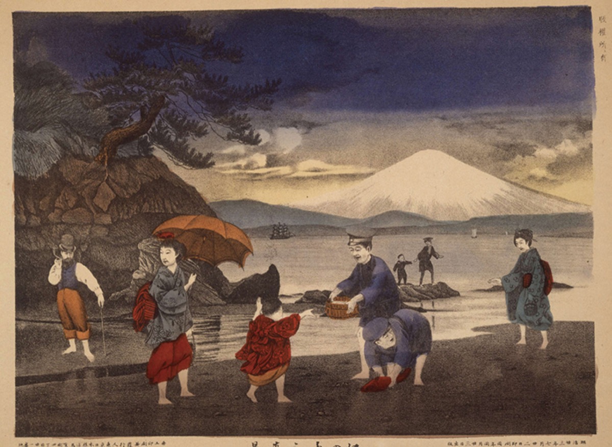 1875年に三代歌川広重が制作した『東海名所改正道中記』は、文明開化期の東海道の風景を浮世絵として描写したもの。明治以降に現れた電灯や電柱、鉄橋を渡る鉄道、外国人や洋傘などが、江戸時代の名残りである髷を結い和装のままの市井の人びとと同じ風景の中に描かれる。
