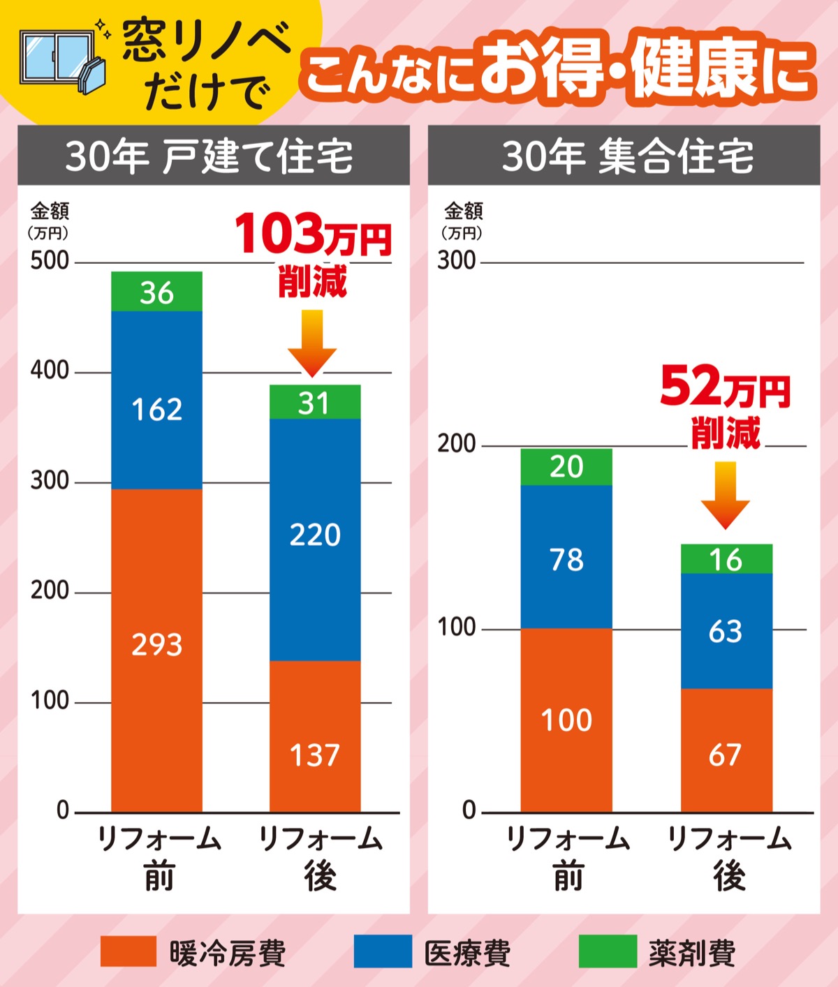 「窓リノベの有無と、住む人の体調やコストとの相関性が明らかになりました」と同社。(株)LIXILの調査で、戸建て住宅の窓改修を行った世帯では医療・薬剤費が30年で平均約30万円削減、暖冷房費も約73万円削減されることがわかった。「健康を維持し、節約にもなるのが窓リノベの特長です」