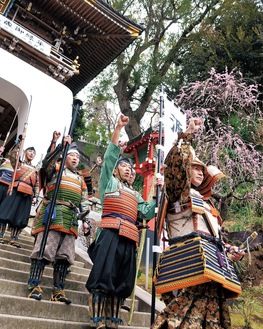 その後、ほら貝の音とともに階段を下り、江の島弁財天仲見世通りまで練り歩きながら、観客に甲冑姿を披露した。一行は、時折立ち止まり、つるのさんの「えい、えい、おー」の掛け声に合わせて勇ましく拳を天に突き上げた。