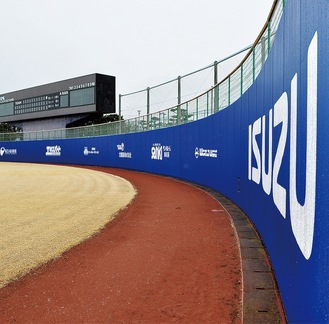 市内で唯一観覧席スタンドを持つ球場である八部公園野球場(鵠沼海岸)の1塁側外野防護マットの改修工事が完了し藤沢市が5日、工事費用を出資した各企業・団体の代表らを招いた内覧会を開催した。