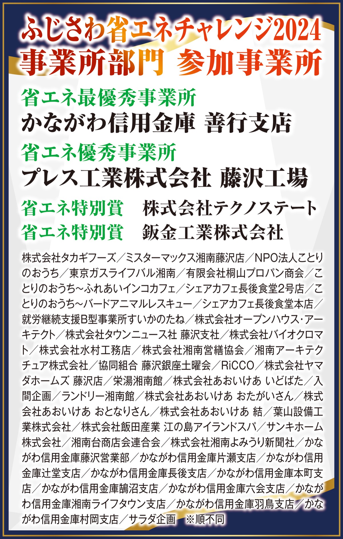 2050年カーボンニュートラルに向け、節電意識を啓発する「ふじさわ省エネチャレンジ2024」の表彰式が3月5日、市役所で行われ、かながわ信用金庫善行支店とプレス工業藤沢工場が鈴木恒夫市長から表彰された。