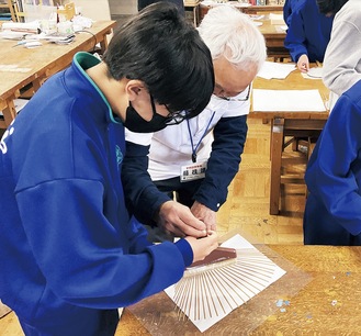 生徒らは希望した業種で、うちわ作りや木を削るパズル、練り切り作りを体験した。洋菓子作りでホールケーキを作成した生徒は、「クリームの混ぜ方でスポンジの塗りやすさが変わり難しかった」とし「甘すぎず美味しい。何個でも食べられる」と笑顔を見せた。今回の事業を取り仕切り、自身は左官業として授業を行った同団体副会長の柴田勝義さんは、実施の理由として昨今の後継者不足などの課題を挙げた。「まずは職人の仕事を知ってもらうことが重要」とし、「さまざまな質問が出て、興味を持ってくれたと思う。いずれこの授業を思い出してくれれば」と語った。