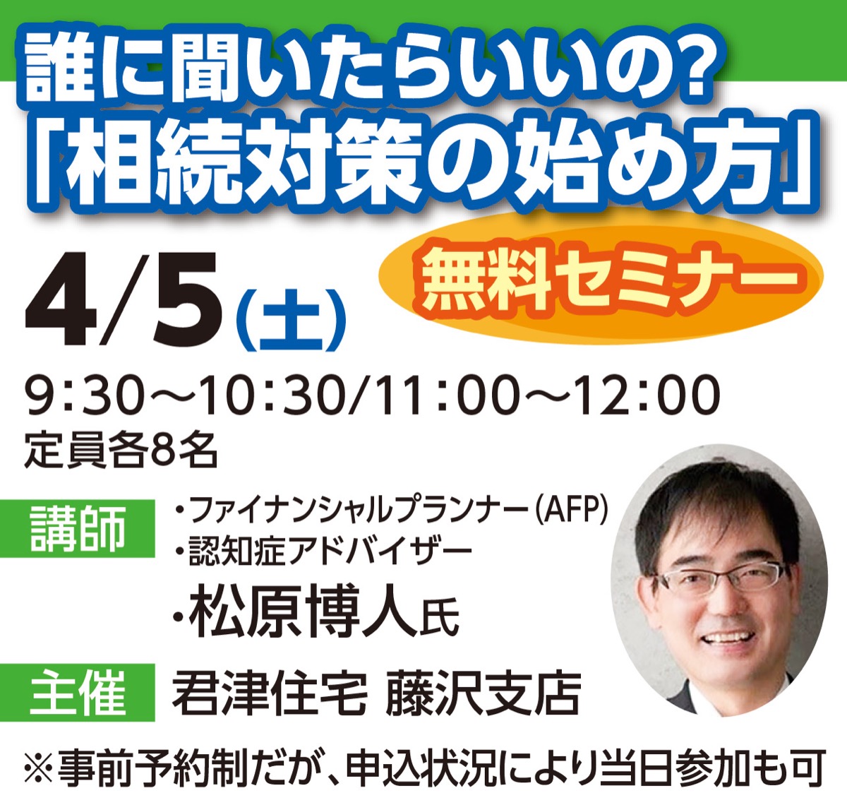 今年1月、鵠沼松が岡にオープンした「君津住宅 藤沢支店」の主催。当日は、ファイナンシャルプランナーで認知症アドバイザーの松原博人氏が講師を務め、不動産相続の始め方や必要性、その方法などを分かりやすく解説する。希望があれば後日、同社顧問の司法書士や税理士の相談も可。