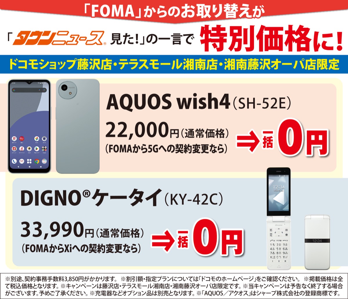 先の3店舗では現在、「タウンニュースを見た」と店頭で伝えると、5G対応スマホ「AQUOS wish4」、または4G対応の折り畳み携帯「DIGNO(R)ケータイ」へ”0円”での取り替えが可能な特別キャンペーンを実施中だ(別途事務手数料)。各店のスタッフは「スマホ教室の開催など購入後のサポートも行っております。まずはお気軽にご連絡を」と呼び掛けている。