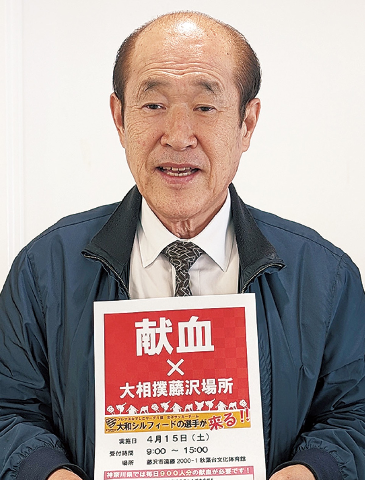 大相撲藤沢場所の開催にあわせて行われる献血キャンペーンが今年も4月12日(土)、藤沢市秋葉台文化体育館で実施される。午前9時から午後3時。同場所勧進元で、日本赤十字社理事も務めている最上重夫さんは「一人でも多くのご協力をお願いします」と呼び掛けている=写真。