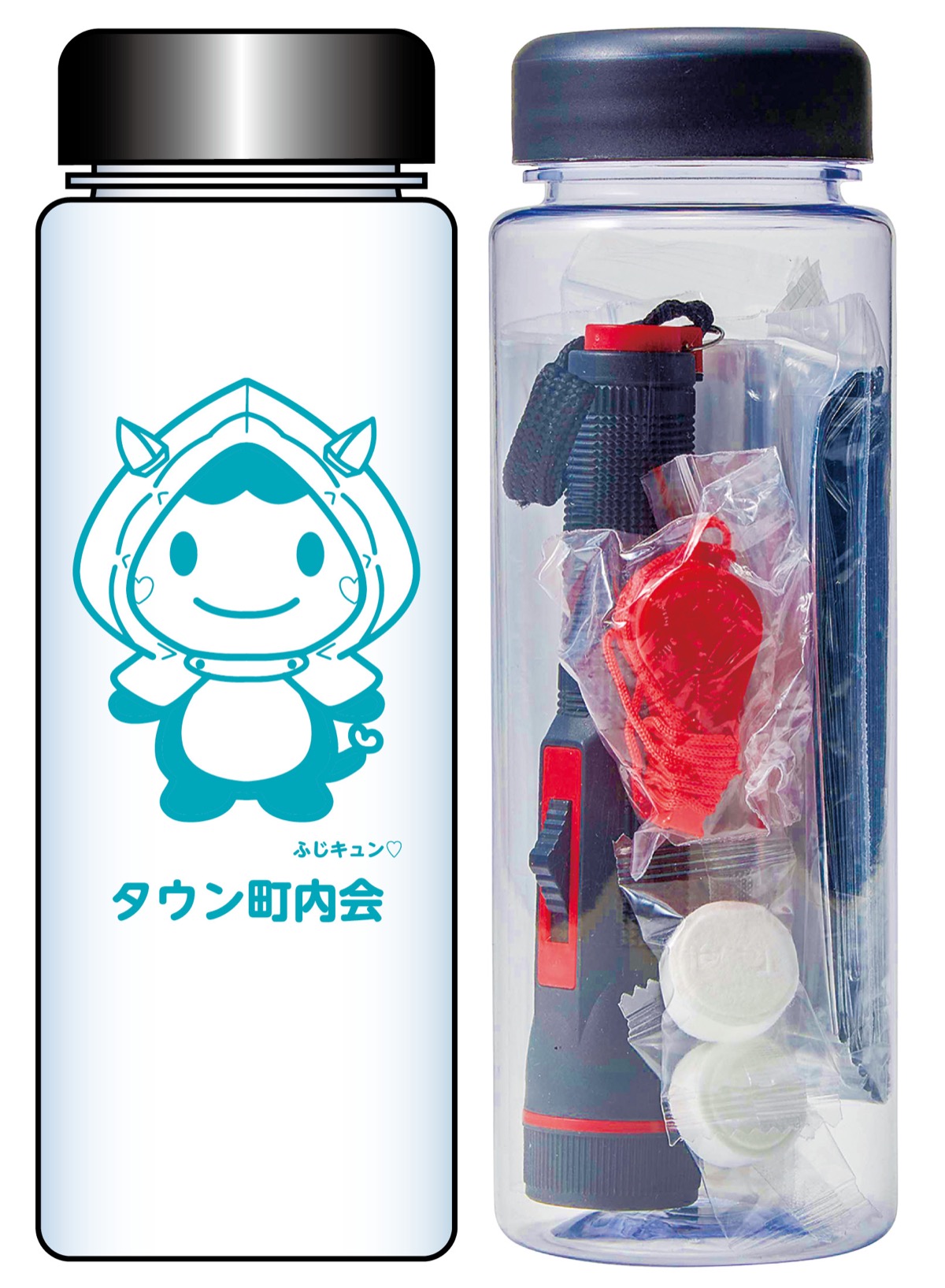 阪神・淡路、東日本、能登半島と大地震が起きるたび、災害に向けた備えの大切さが再認識される。タウンニュースではいざという時に役立つアイテムがまとまった「防災ボトル」に、藤沢市公式マスコットキャラクター「ふじキュン♡」のイラストと団体名などを印刷したオリジナル商品の取り扱いを開始した。