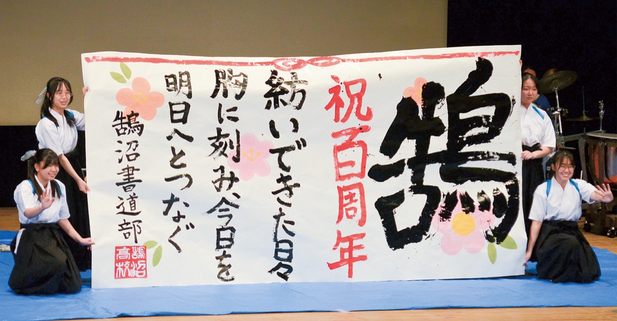 開校から現在までの歩みを動画で紹介した後、書道部とマーチングバンド部がステージ上でパフォーマンス。両部員たちは100周年の思いを込め、音楽に合わせて大判の和紙に筆を走らせた。完成作品をお披露目すると、会場から大きな拍手が送られた。