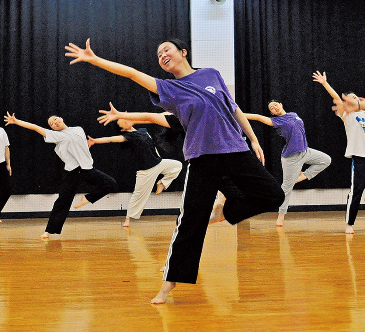 講堂で繰り広げられるコンテンポラリーダンス。一糸乱れぬ華麗な舞を実現させることは最大の楽しみであり、苦しみでもある。体で分かってくるには、集中力と時間を要する。手先つま先の表現にまで細心の注意を払う。
