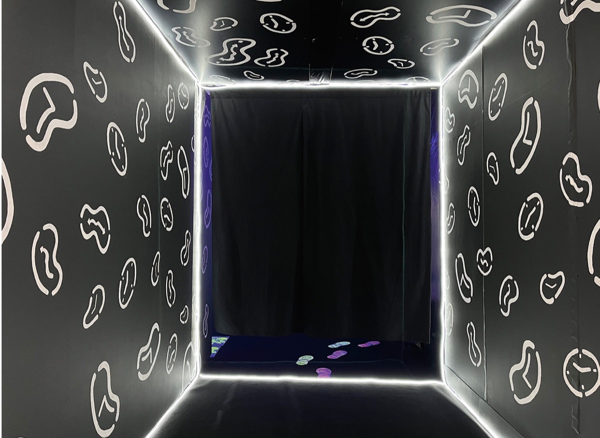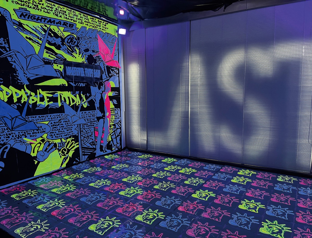 「過去・現在・未来」をテーマに、出入り口から、壁や床、天井などの空間中に時間の推移を表す絵が描かれている。恐竜や浮世絵などをモチーフにした作品や、メッセージを盛り込んだ壁画をブラックライトで照らし未来を表現した作品が楽しめる。同集団は「地元で作品展ができてうれしい。気軽に立ち寄っていただければ」と呼びかけている。