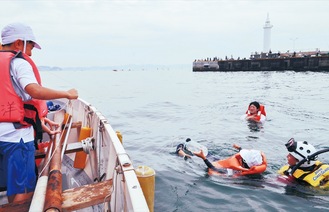「もし海に落ちてしまったとして、ライフジャケットを着ている人が助かる可能性は80%以上。ちゃんと着ていなければ30%にまで下がる」など、岸壁で海上保安庁湘南海上保安署の職員から落水時の注意を受けた団員たち。その後、2隻のボートで湘南港を出港した。保安署職員が見守る中、溺水者役の団員がボートから海へと飛び込み、「助けて」と大きな声を上げながら救助を求めた。ボートから投げ入れられたひも付きのペットボトルやクーラーボックスを抱きかかえ、無事に引き上げられた。