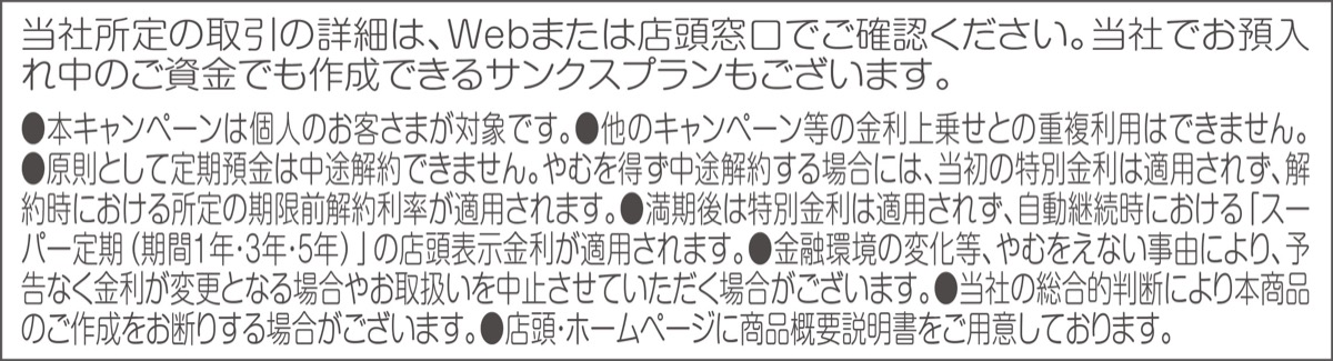 同キャンペーンは店舗窓口で、【1】新規で100万円以上をスーパー定期(預入期間1年)に預け入れると、年利0・7〜0・8%の特別金利が適用されるウェルカムプラン、【2】預入10万円以上対象のサンクスプラン【預入期間最長5年、最大年利0・8%(税引後年利0・637%)】を用意。