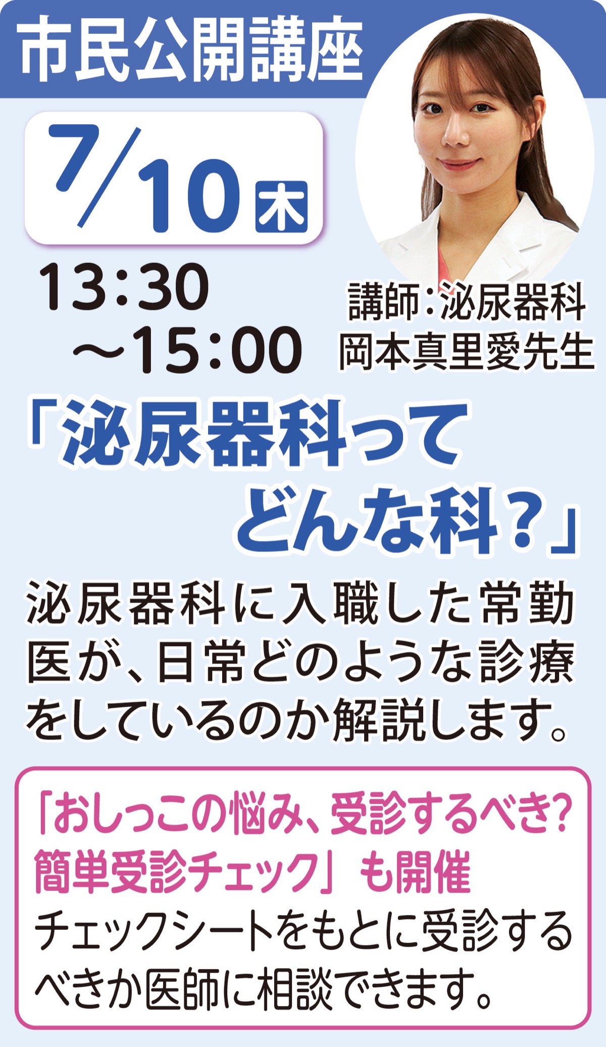 来月10日(木)の午後1時30分からは、同院2階講堂で公開講座「泌尿器科ってどんな科?」を開く。講師は泌尿器科常勤医の岡本真里愛さん。普段の診療について説明する他、排尿の悩みについて受診するべきか相談できるコーナーも。参加無料、申し込み不要。