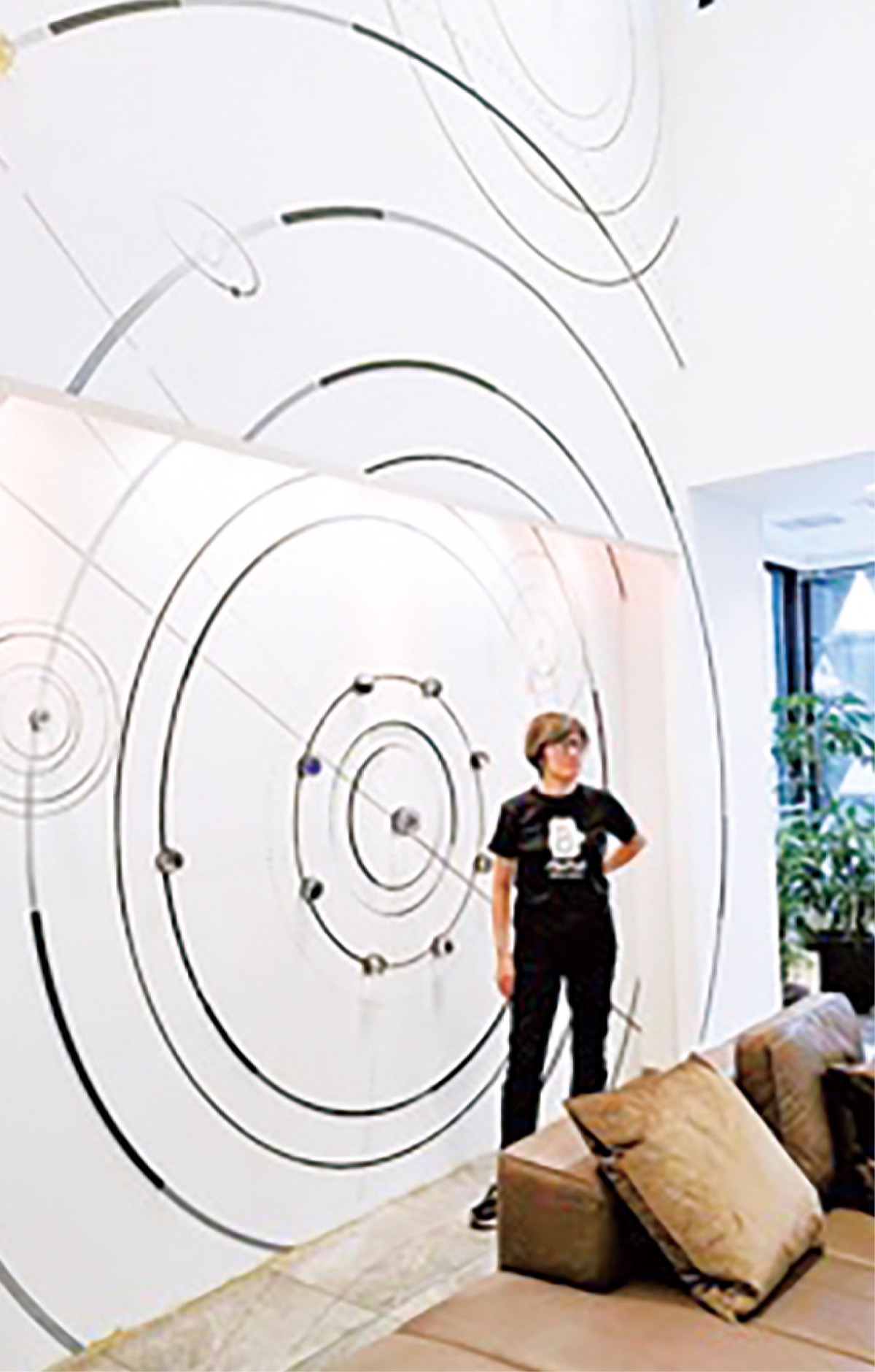 そんな地域のために開かれたこのフロアの壁面いっぱいに広がるのが、吹き抜け2階分を超える、地元ガラス工芸作家のノグチミエコさんと職人による作品「フラットラクス」だ。ラテン語で「光あれ」を意味し、中世の宇宙図をイメージして作られている。