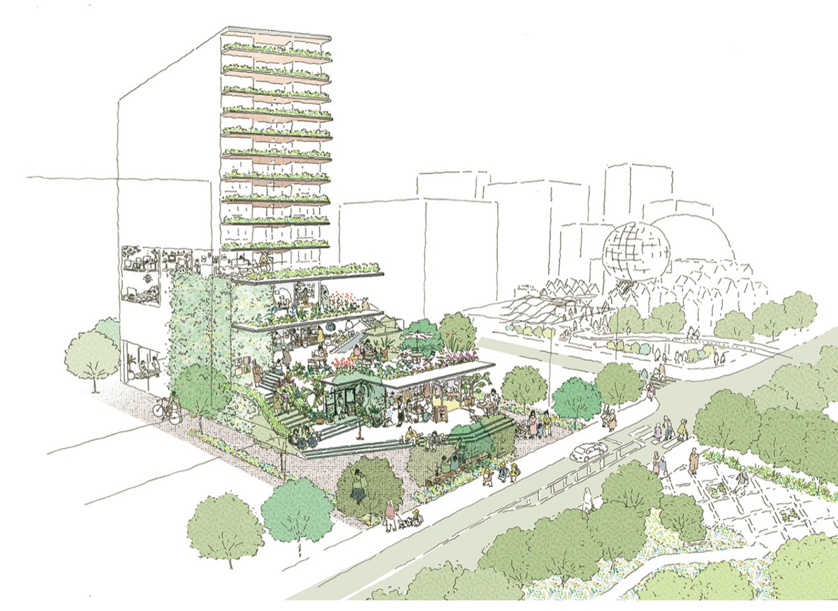 地上14階建て。地域交流を促すポケットパークやテラス、大階段が設置されるほか、飲食店なども入る。地元農家を招いたワークショップも視野に入れ、農村の風景を建築物を通じ再現する。