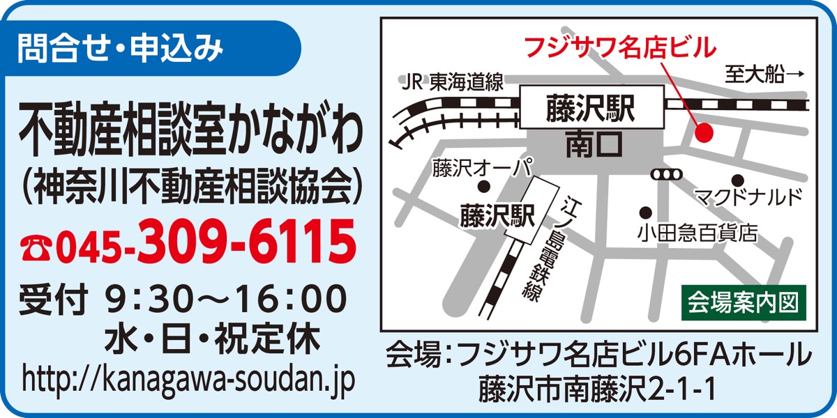 「不動産相談室かながわ」が毎月各地で開催中の相続と不動産に関する無料相談会。7月19日(土)に、JR・小田急線藤沢駅南口すぐの「フジサワ名店ビル」6階Aホールで開かれる。