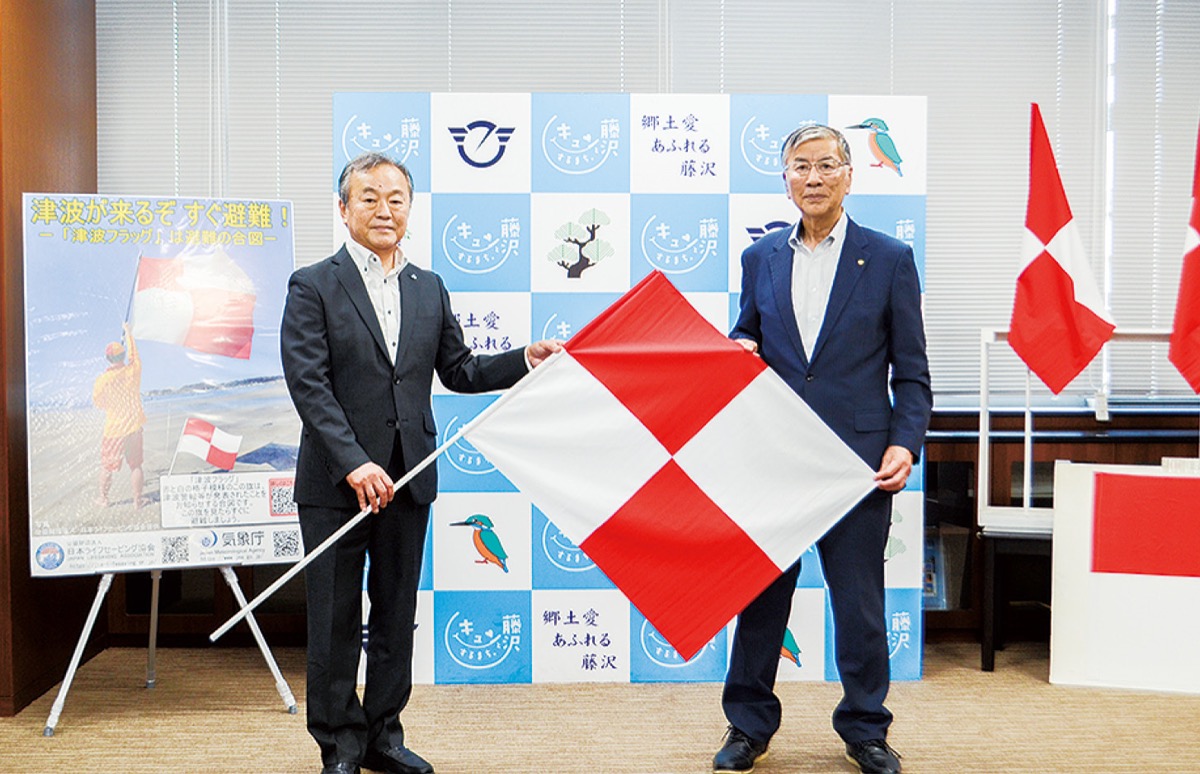 藤沢、茅ヶ崎、寒川の2市1町の事業者約3500社が加入する(公社)藤沢法人会(相原厚志会長)は16日、海開きを前に「津波フラッグ」を藤沢市に寄贈した。