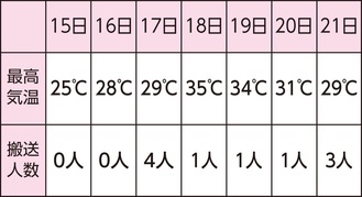 先週1週間(15日〜21日)で、藤沢市内の熱中症による救急搬送件数が急増した。市消防局によると、この期間中の熱中症搬送件数は10件と大幅に増加し、特に65歳以上の高齢者の搬送が7件と最多だった。5月1日からの集計結果は17件だったため、1週間で1・4倍となった。