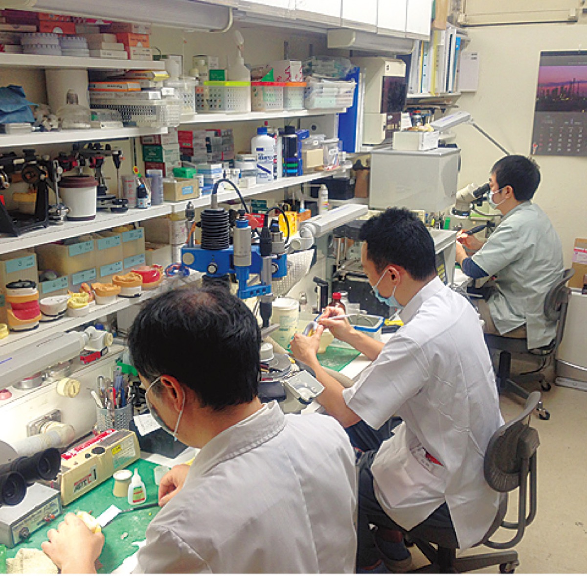 院長の角田は40年近く東京赤坂、藤沢市辻堂で噛める自費入れ歯の研鑽・研究を積み重ねてきました。精密な入れ歯造りには技術の高い専門技工士との連携が必要と感じ、辻堂に続き鵠沼にも院内技工所を設置。自費歯科技工諸設備を完備し、自費入れ歯専門技工士1名とセラミック専門技工士2名が、自費入れ歯やインプラント、クラウンを製作しています。それ故に外注では実現できない精密さや修理の速さ、的確さが可能です。