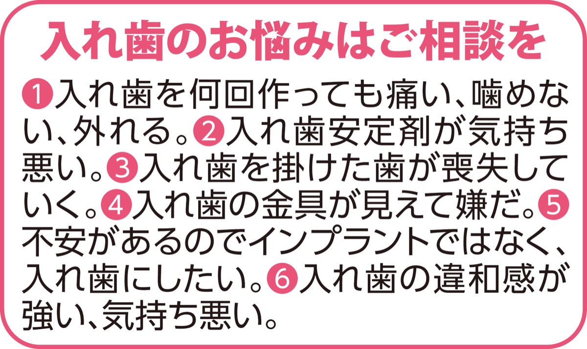 人生百年の超高齢化時代。歯の喪失にはインプラントが最適ですが、全身的疾患や骨の状況、経済的問題で、入れ歯に頼らなければならない高齢者の方も増えています。