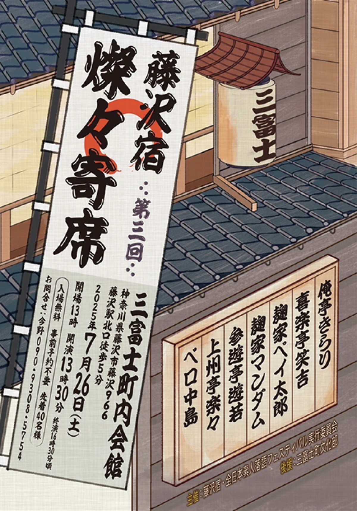 「第三回 藤沢宿燦燦寄席」=写真(チラシ)=が7月26日(土)、三富士町内会館(藤沢駅北口徒歩5分)で開かれる。毎年9月に行われる「藤沢宿・全日本素人落語フェスティバル」実行委員会の主催。同フェスで最優秀賞を獲得した喜楽亭笑吉さんのほか、ペロ中島さん、上州亭楽々さん、参遊亭遊若さん、麹家マンダムさん、麹家ペイ太郎さん、俺亭きらりさんの社会人落語家7人が出演し、話芸を披露する。