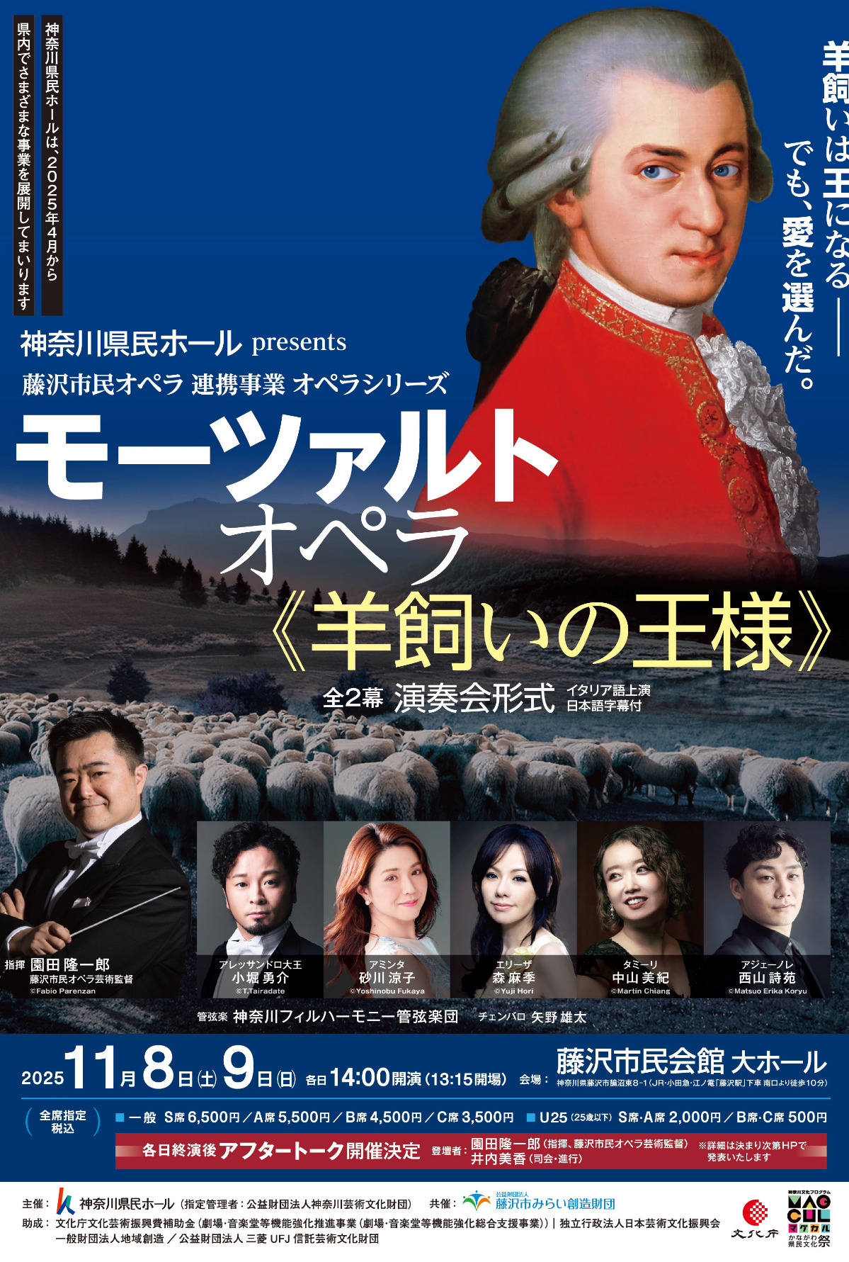 ■オペラ『羊飼の王様』全2幕(演奏会形式/イタリア語上演・日本語字幕付)▽日時=11月8日(土)・9日(日)午後2時開演▽場所=藤沢市民会館(藤沢駅南口徒歩10分)▽指揮=園田隆一郎▽出演=小堀勇介、砂川涼子、森麻季、中山美紀、西山詩苑▽管弦楽=神奈川フィルハーモニー管弦楽団▽料金=全席指定でS席6千5百円、A席5千5百円ほか。25歳以下S席・A席2千円ほか▽予約はチケットかながわ【電話】0570・015・415(10時〜18時)