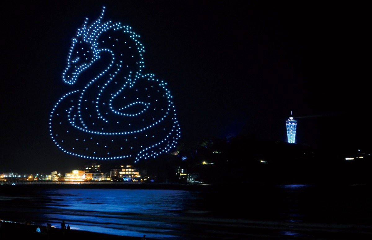 片瀬西浜・鵠沼海水浴場で19日、ドローンショーが行われ、幻想的なアートで夜空が彩られた。江の島海水浴場協同組合の主催。