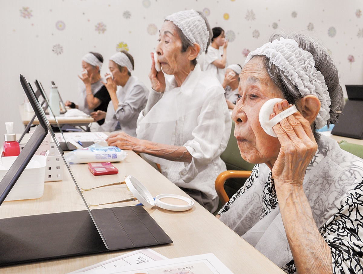 「化粧の力で介護予防」を掲げる同社では、心身機能や生活の質の向上が期待される「化粧療法」を取り入れた教室を全国で開いている。