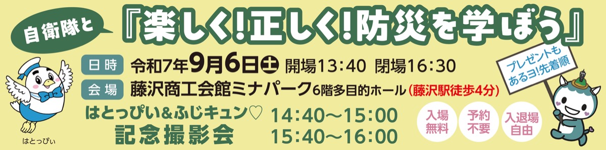 当日は、自衛隊の災害派遣活動の講話や装備品の展示、藤沢市の災害への備えなど役立つ情報が盛りだくさんの講演会が行われるほか、自衛官なりきり撮影会や防災グッズのプレゼント(先着80組)もある。