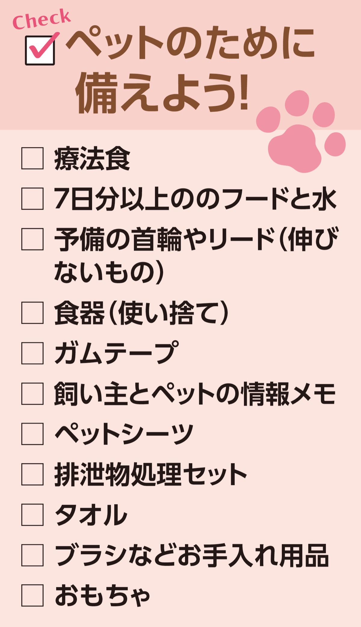 「飼い主の皆さんにはぜひ、普段からの備えをしっかりしておいてほしい」とも。ケージやフードなど物資の備えの他、ペットの性格も踏まえた訓練も推奨している。ケージに慣れさせたり、避難所に向かう練習をしたりして、家族が避難時間を短縮できるようなシミュレーションの実施を呼びかけている。