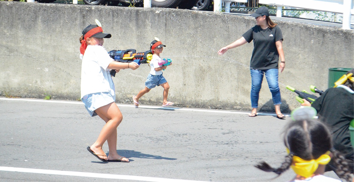 「水鉄砲バトル」コーナーでは子どもたちが、互いの頭に装着した金魚すくいの「ポイ」を水鉄砲の的に狙いながら走り回った。見事、自分の的を守り切った8歳の女の子は「当てるのは難しかったけれど楽しかった」と笑顔を見せた。