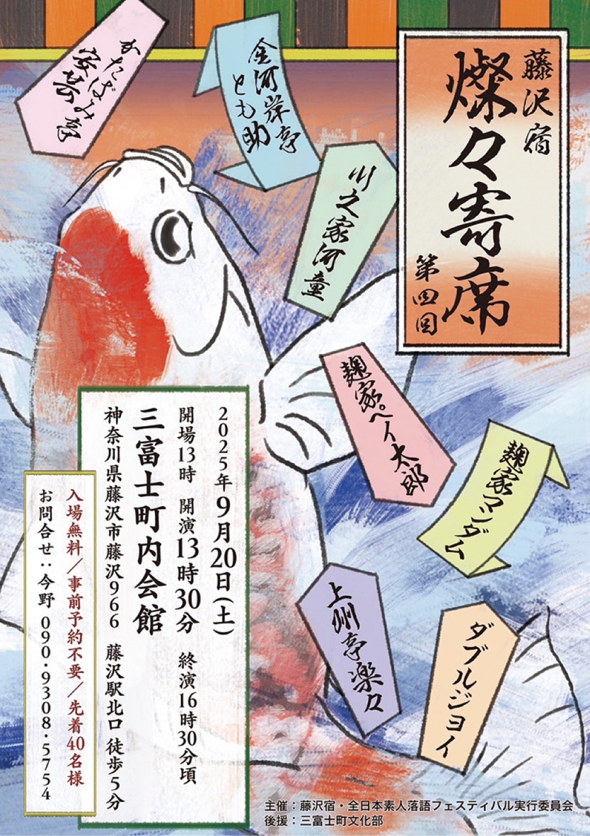 「第四回 藤沢宿燦々寄席」=写真(チラシ)=が20日(土)、三富士町内会館(藤沢駅北口徒歩5分)で開かれる。27日(土)に行われる「藤沢宿・全日本素人落語フェスティバル」実行委員会の主催。