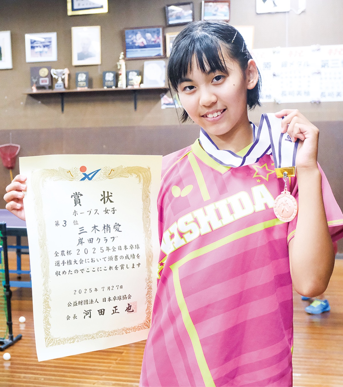3年後に控えるロサンゼルス五輪への出場が期待される長崎美柚選手など、全日本選手権やインターハイ出場選手を数多く輩出するのが、湘南台に拠点を置く卓球クラブチーム「岸田クラブ」(三木朋子代表=人物風土記で紹介)だ。先ごろ、兵庫県で開かれた「全農杯2025年全日本卓球選手権大会」では、所属する三木梢愛さん(湘南台小6年)がホープス(小学5・6年)女子の部で3位入賞を果たした。