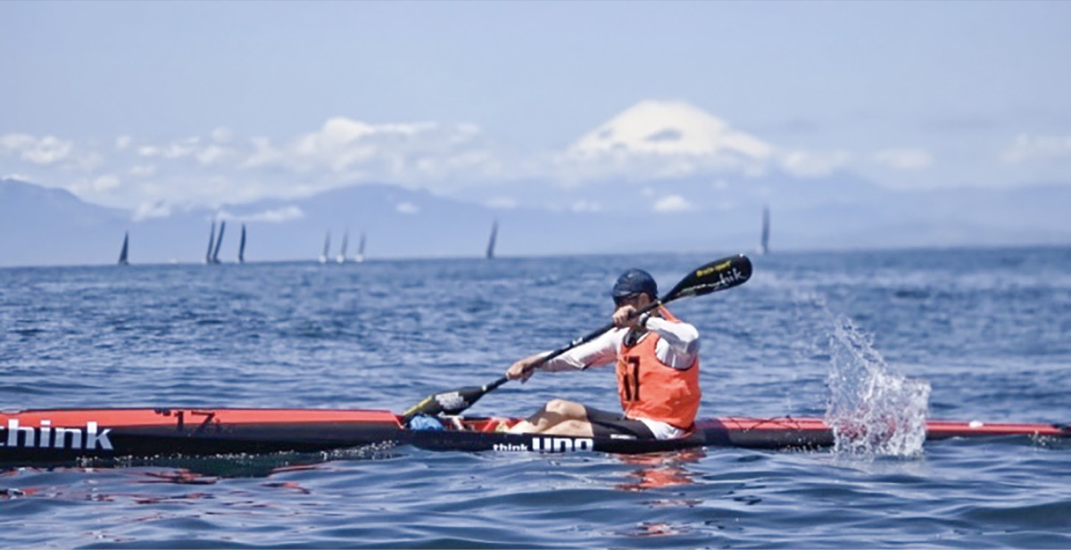 カヌーオーシャンレーシングは、約21Kmの長距離を細長い形状の船、サーフスキーに乗り、パドルを使って漕ぎ進み着順を競う。船を漕ぎ続ける持久力、波や風に負けない体力が求められるスポーツだ。
