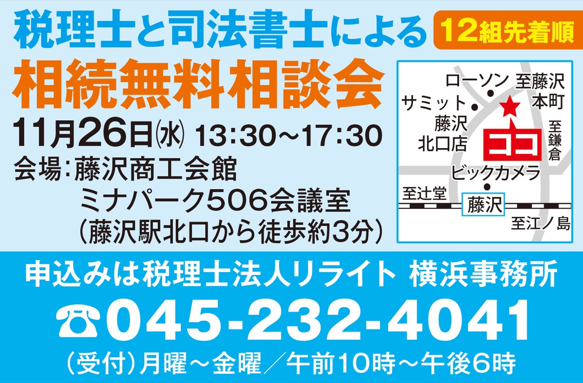 相続対策や相続税申告に関する無料相談会が11月26日(水)、藤沢商工会館ミナパーク506会議室で開催される。午後1時30分〜5時30分の中で相談時間は1組30分程度。