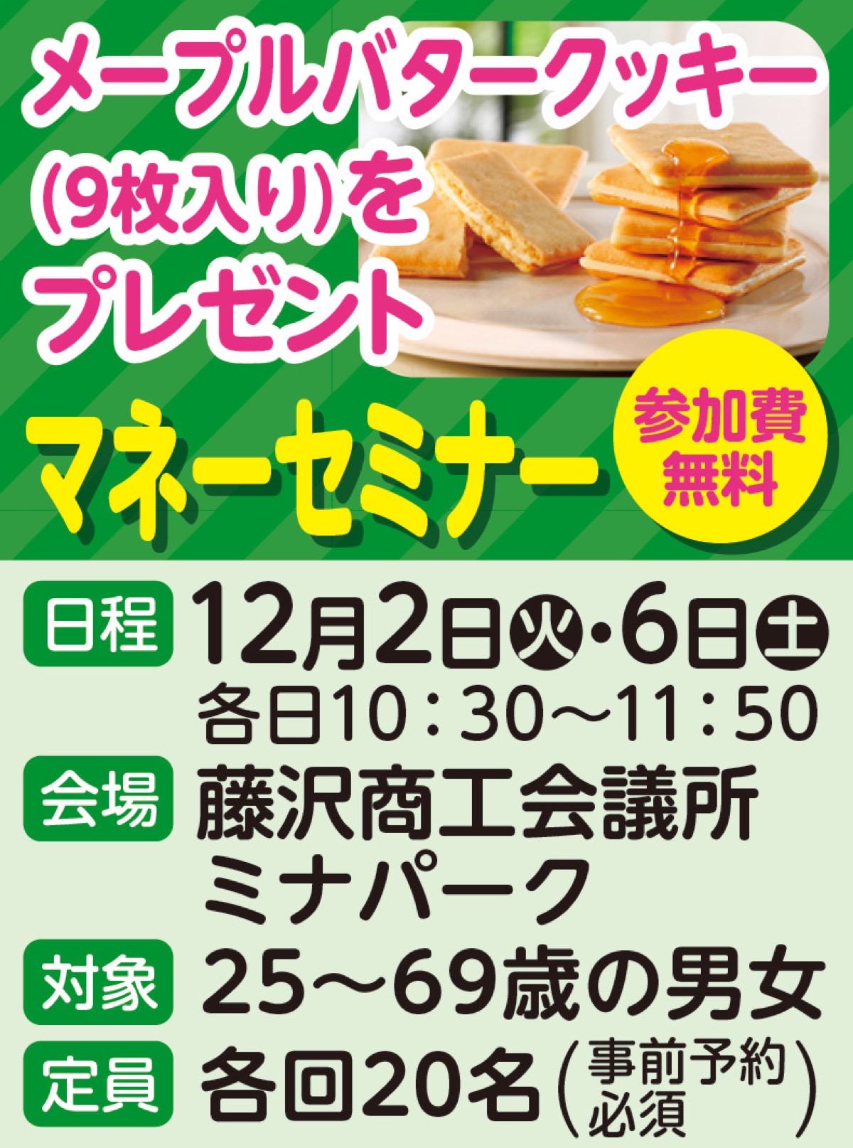 子育て・教育資金から老後資金、資産運用、相続などのお金について学ぶことができるマネーセミナーが12月2日(火)・6日(土)、藤沢駅北口徒歩3分の藤沢商工会議所ミナパーク301号室で開かれる。「将来への漠然とした不安を解消してくれる」との声を集める資産アドバイザーの蔵野雅章さんが開くマネーセミナーでライフプランの幅広い悩みに対応。新NISA、iDeCoも初歩からわかりやすく解説してくれる。対象は25〜69歳の男女で参加無料。時間は両日共に午前10時30分開始、11時50分まで。各定員20人・事前予約制。申込・詳細は専用の二次元コードから。(問)ファイナンシャル・ジャパン(株)蔵野さんまでメール(masaaki.kurano@financialjapan.jp)または電話【携帯電話】090・5766・4889まで。