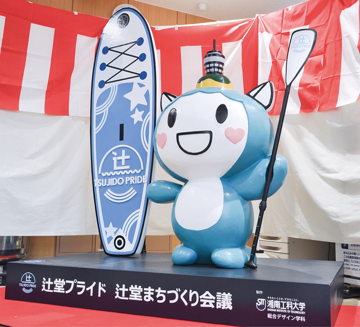 同会議がまちづくりの合言葉として提唱する「辻堂プライド」の浸透を図ることが狙い。縦約220cm、横約130cm。広報委員長の鶴田智博さんは「SNS映えするフォトスポットとして辻堂の新名所になれば」と期待した。現在は市民センター正面玄関横の交流スペースに常設展示されている。