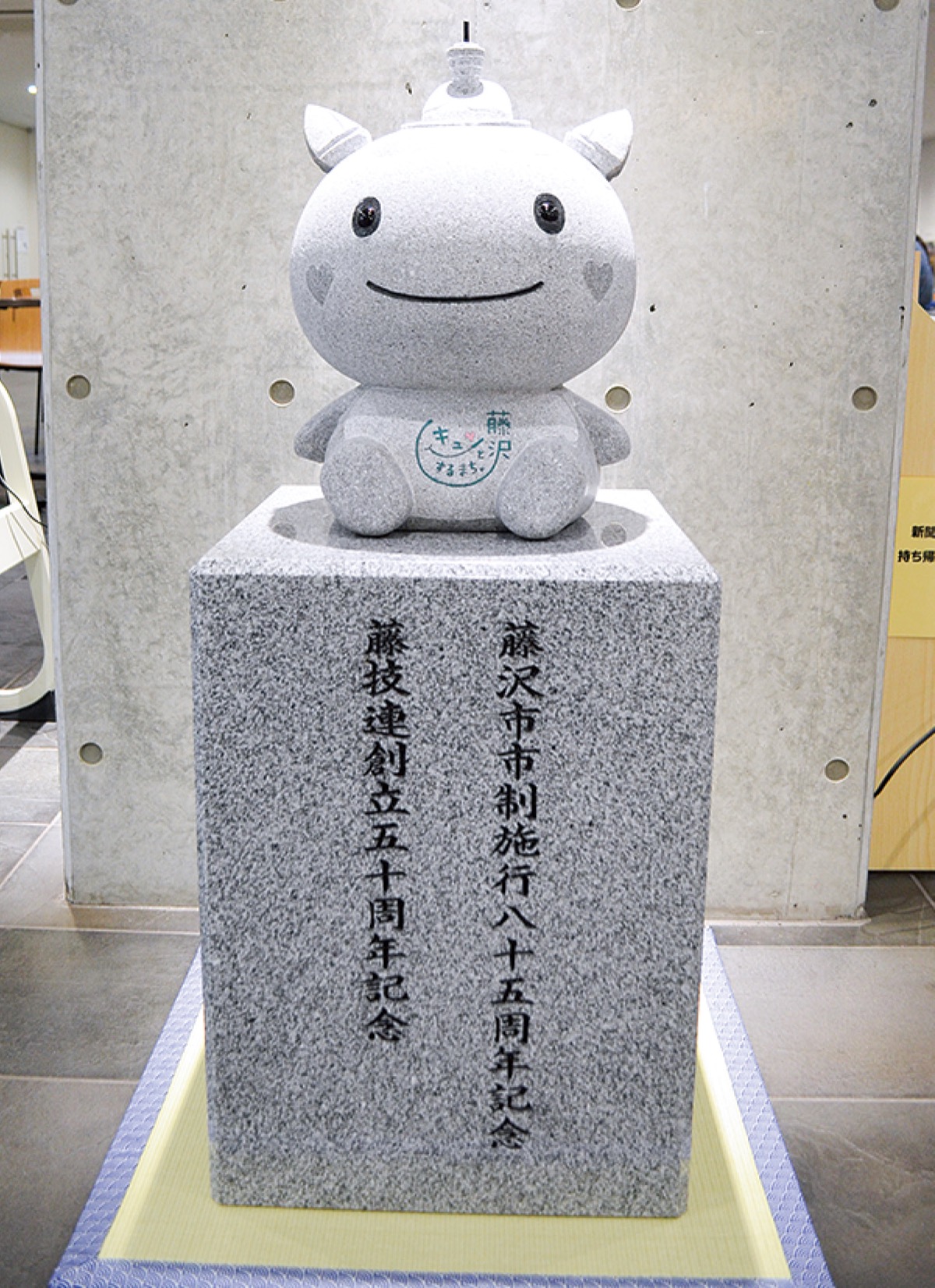 ふじキュン♡の石像は今月10日から同市民センター2階に設置されている。体の部分には高級石材「小呂青石」、目には「オニキス」が用いられた。また、台座の下には同会所属の畳組合湘南による畳が敷かれ、周りを囲うアクリル板は県広告美術協会湘南支部藤沢地区による製作、お披露目の際の布は湘南地区洋裁組合藤沢が作るなど、藤技連の職人の技が集結したモニュメントとなった。青木会長は「市民センターのシンボルとして、職人の技術が残っていってほしい」と思いを述べた。