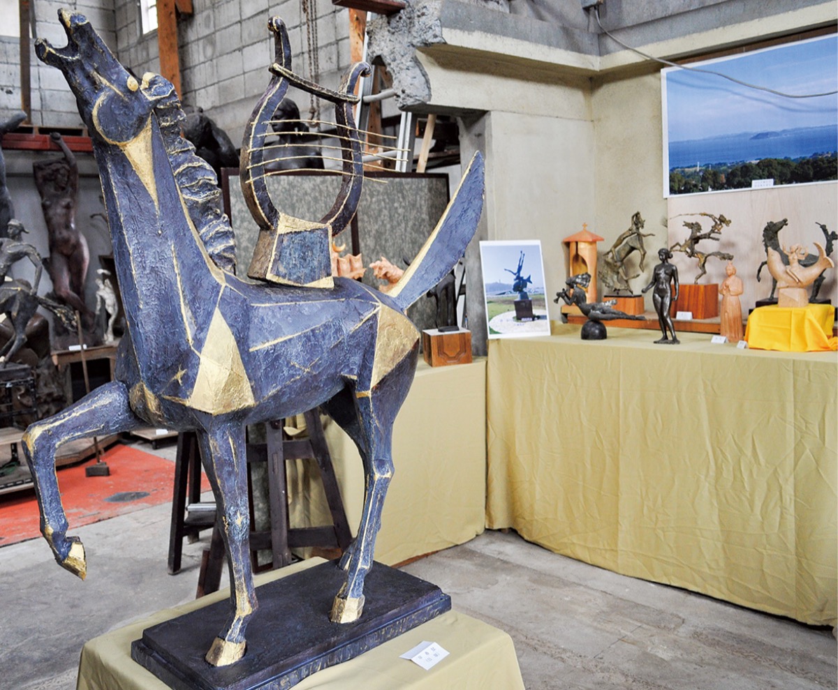 工房展では、親松さんが30代の時に制作したリンゴを手に持つ『エバ』や、40代半ばで「彫刻家として最も充実していた時の会心の作」という『レクイエム(主の降架)』、日本最大の公募美術展として知られる「日本美術展覧会(日展)」に今年出展した馬の背中に竪琴が乗る『早春賦』など、これまで手掛けてきた作品大小100点以上が並ぶ。