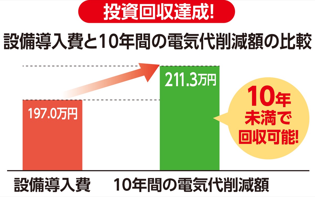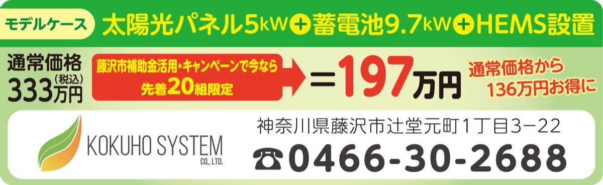 藤沢で20年以上に渡り太陽光発電の施工を手掛け、市役所や市内小中学校の太陽光設備も手掛けるなど信頼を集める(株)コクホーシステム(辻堂元町)は、今年度の「藤沢市住宅用太陽光発電システム(自家消費型)等設置費補助金」を活用した導入を勧めている。同社によると、同補助金を利用すると設置費用を106万円抑えることができ、10年未満で回収可能な場合がある。1カ月平均400kWhの電気を使用する家庭は15年間で電気代を約317万円も削減でき、回収後の発電分はすべて利益になる。